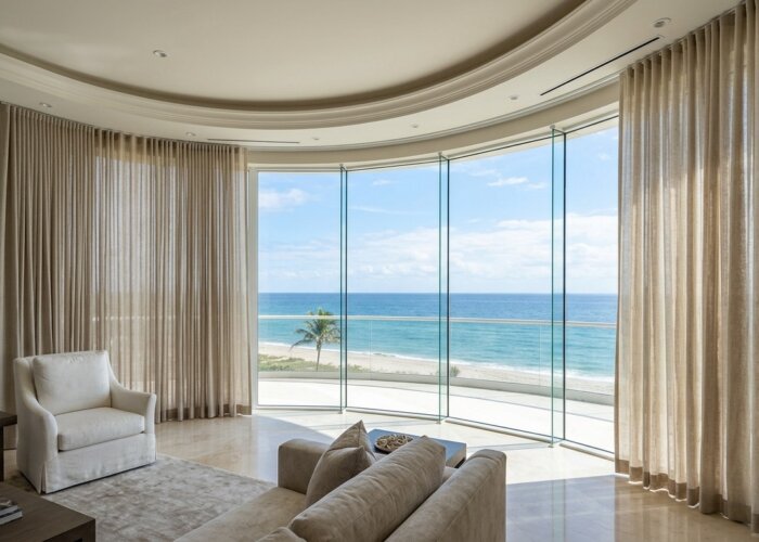 The Specialized Track: Unlike a standard curtain rod, these are architectural-grade tracks containing reinforced, steel-core belts. They are highly customizable and can be bespoke-curved to accommodate the rotunda entries, bay windows, or continuous "glass wall" curves often found in luxury high-rises on Flagler Drive.