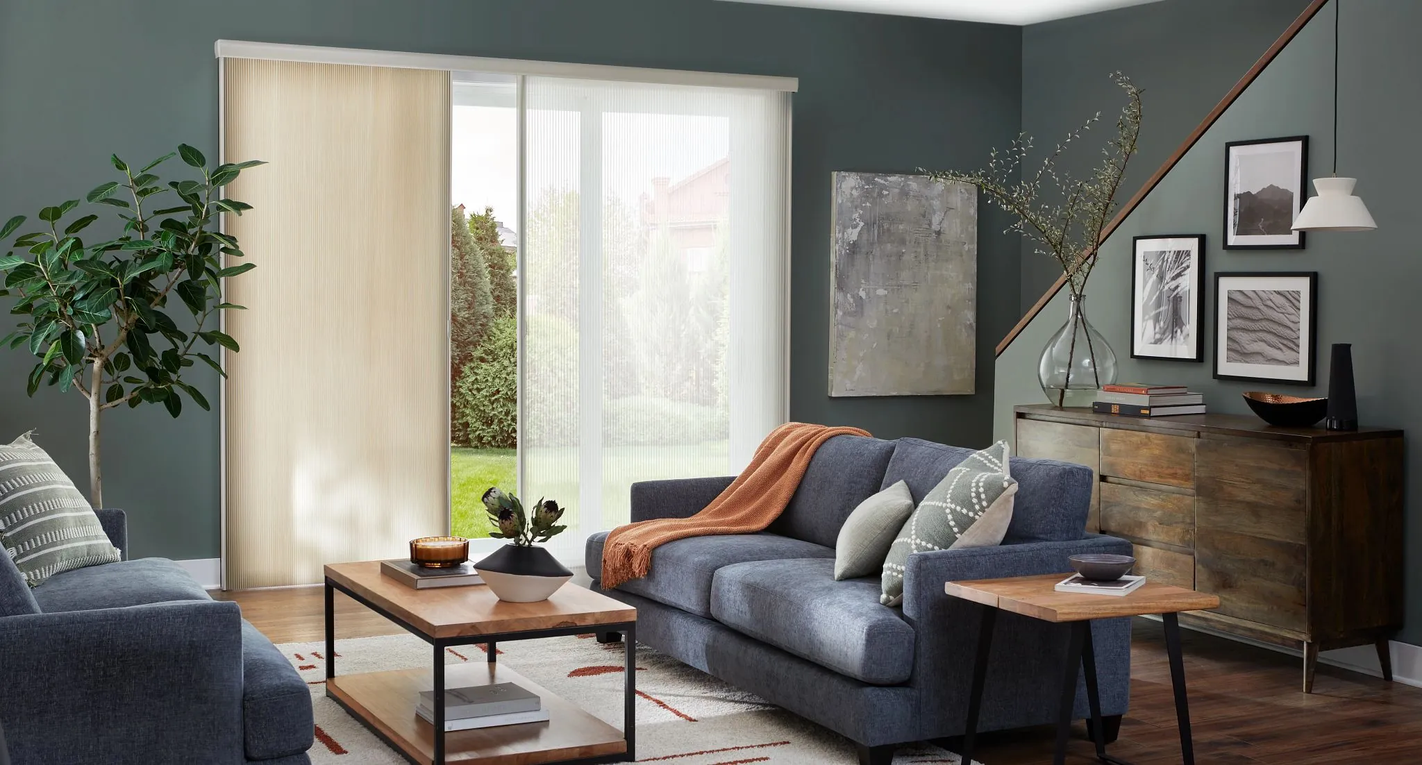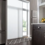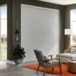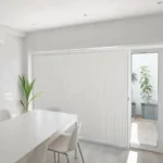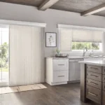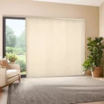 These shades feature a clean, contemporary vertical orientation. They complement modern architectural styles effectively. The vertical design allows for easy operation on sliding doors. Sleek appearance enhances the overall aesthetic of large windows.